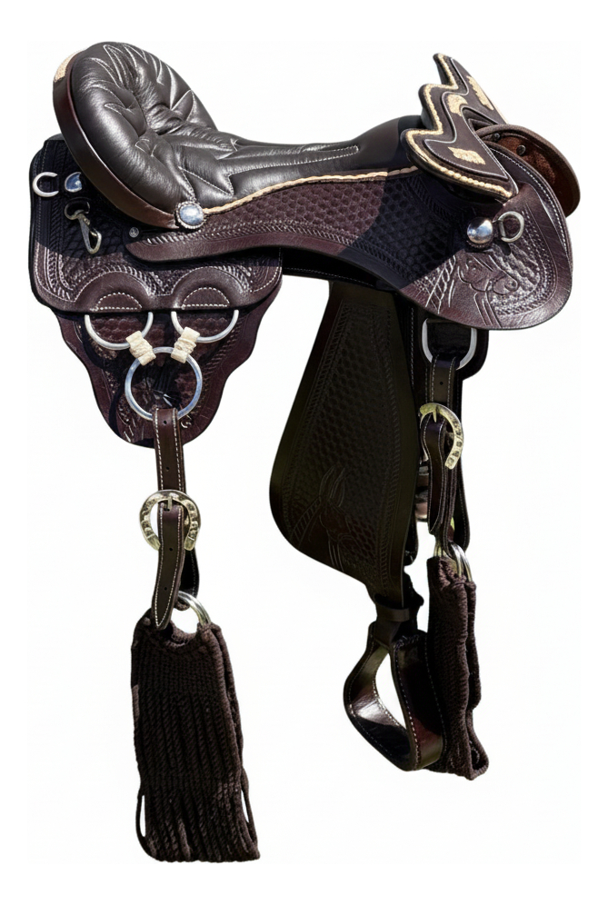 Arreio produzido em couro legítimo de búfalo bem tratado de alta qualidade. armação em fibra de vidro de alta resistência, todo desenhado em rebaixo ( artesanalmente ) e com as 3 argolas trançadas em couro cru. ferragens em aço inoxidável ( livre de ferrugens ) .